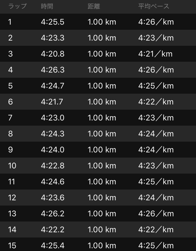 面白味に欠けるが、ラップはこんな感じで。GPSの誤差によるブレはあるが、ほぼ一定ペースで終了。