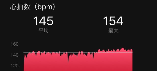 心拍数145。40km走の疲れがまだ残っていて、後半少し上昇。つくば前が143だったので、まぁこんなもんかなと思う。