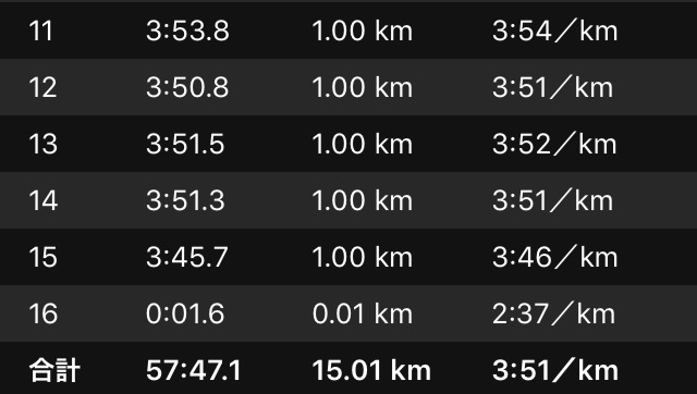 ラスト、少しペースアップし気持ちよく終わるemoji 57'47、ペース3'51で設定クリアemoji