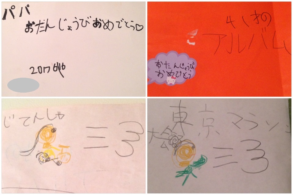 僕の41才の思い出を何枚か絵にしてくれていた。中でも、自転車の絵は感激したemoji ブログにも書いたが、娘が初めて自転車に乗れたのが昨年。親としてはもちろんだが、娘にとっても思い出になっていることの方が、嬉しい。スペシャルドリンクを手渡す大役を果たしてくれた東京マラソンemoji