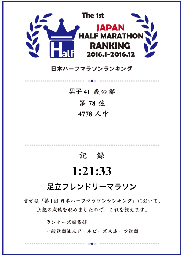 ところで、僕のPBは昨年1月の東京喜多マラソンで優勝したタイム、1:21:03(レポはこちら)。残念ながら、喜多は公認コースではないので、ランキング対象外emoji