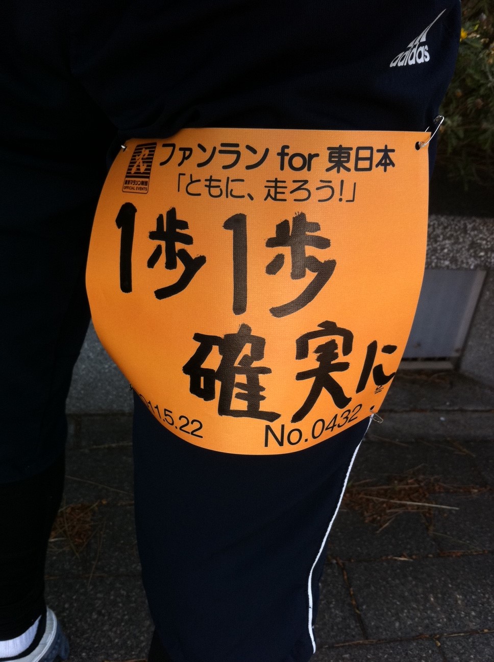 初めて参加した大会は、お台場で開催された「ファンラン for 東日本」だった。ゼッケンに番号はなく、ひとりひとり、メッセージを書いた。