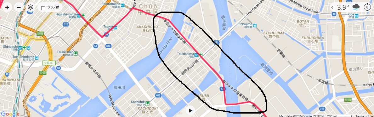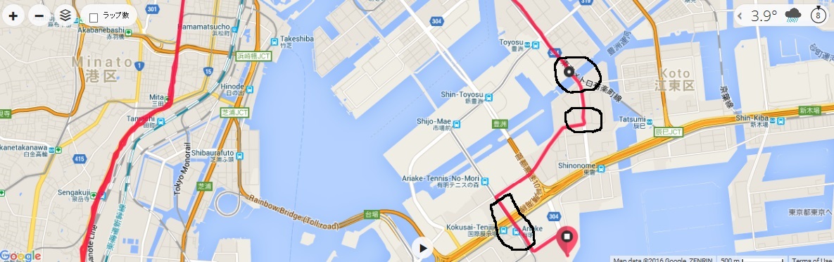 08 February 東京マラソン あれこれ 東京マラソンのスタート・ブロックについて以前書きましたが、肝心の!?タイムロスについて触れなかったので、念のため、自分の経験を書いておきます。 参加大会 ブロック タイムロス 2012年 C 1分51秒 2013年 A 21秒 2015年 B 1分9秒 続いて老婆心ながら、GarminのGPSではご覧のとおり、スタート直後からメチャクチャなことになります。自動ラップはNGですね。距離表示は1キロ毎に↓のような物が埋め込まれていてかなり正確だと思うので、手動ラップ必須です。 因みに、僕のGarminでは、毎回43km前後走ったことになっています。言わずもがな、実際の平均ペースより速いタイムが表示されることになるので、5km毎に目標タイムと比べることが必要になってきます。 コースについては他のブログで詳しくレポートされていると思うので、ここでは一つだけ。 36kmからの佃大橋アップダウン(上のマップで黒く囲んだところ)が最大の難関と言われることが多いような気がしますが、個人的には、39km辺りの東雲橋と41kmの有明駅の坂のほうがよっぽど辛かったです。 佃大橋は歩道がないため、確かに沿道の応援が途切れる区間ではありますが、ダラダラ上りの後はダラダラ下りが待っているし、上がった息を整えるには十分です。しかも、左折して春海橋からは左手にスカイツリーが見渡せ、豊洲駅まで大声援が続くので、走っていて楽しいと思います。問題は東雲橋。距離はごく短いですがなかなかの急こう配で脚にきます。そして、40km付近の中越運送を右折しますが、ここからは沿道の応援が激減し、風景もちょっとさみしくなります。風も強いとさらに凹みます。そしてそして、最後の難関、41km地点の有明駅の坂。結構なダラダラ急こう配。メチャクチャしんどいです。これさえ乗り越えれば感動のゴール!です。 最後までお読み頂きありがとうございます。ポチっとお願いします。