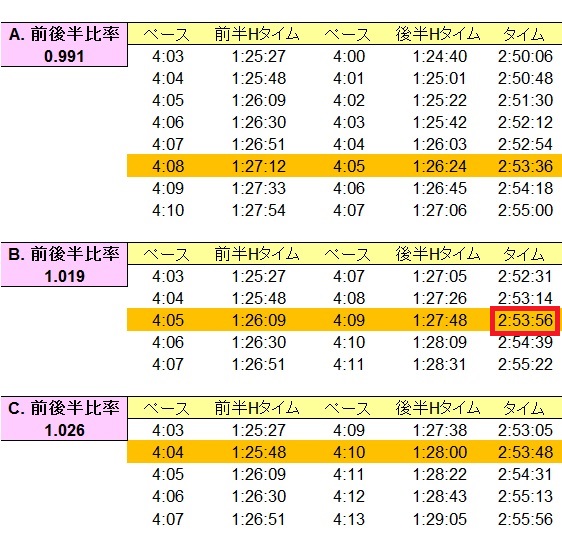 大会テーマの「マラソンを科学する」にならい、過去のレースタイムを自分なりに分析・シミュレーションしてはじき出した想定タイムと、なんと実際の完走タイムが同じだった。ネガティブ・スプリットを除く、好レースの前後半ハーフのタイム比率の平均値1.019を基準にしたわけだけど、あまりの精度?偶然の一致?にビックリしている。
