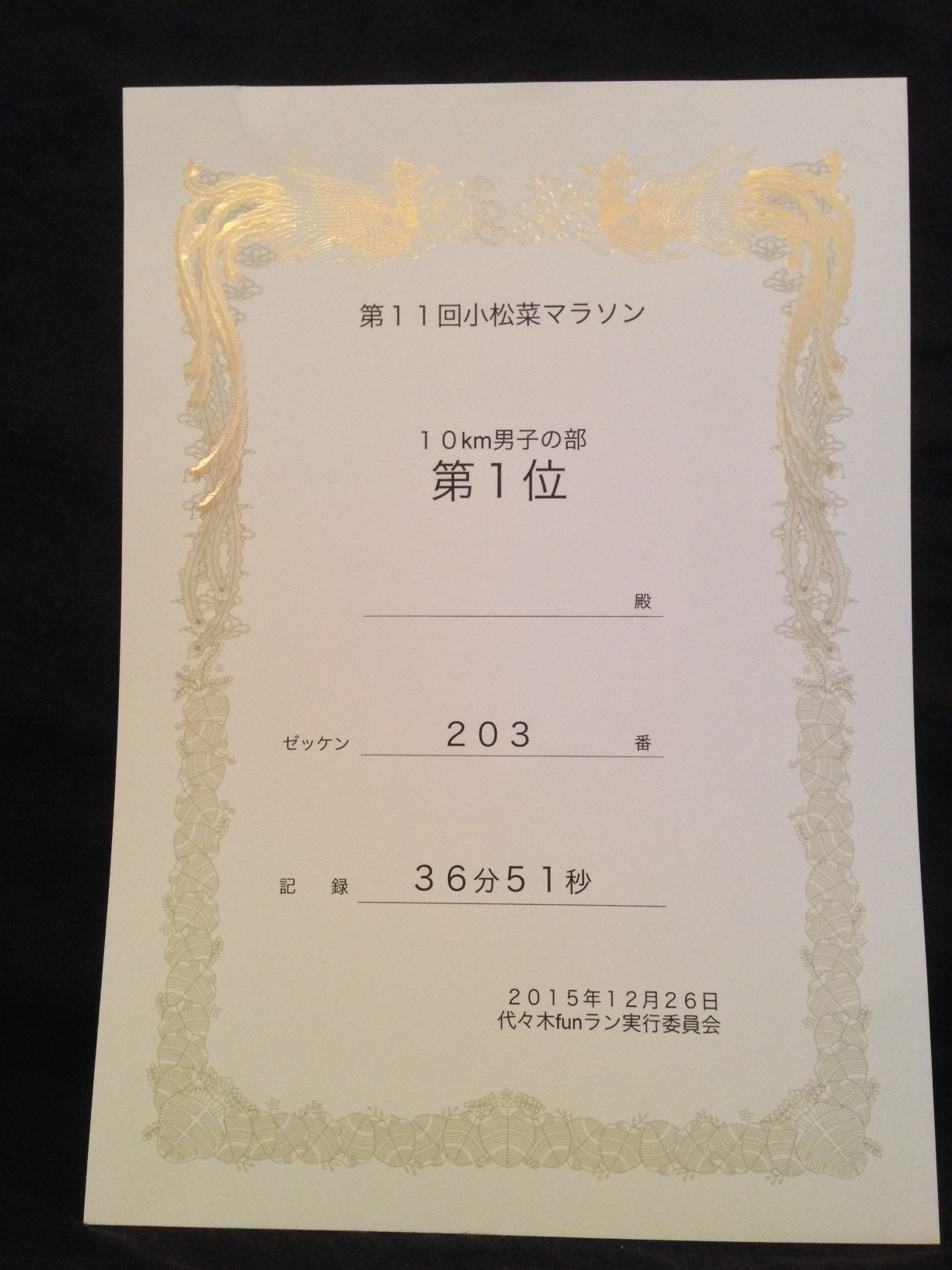 →37分切り達成。優勝。後日、賞状が送られてきて正式タイムは36:52ではなく、36:51でした。