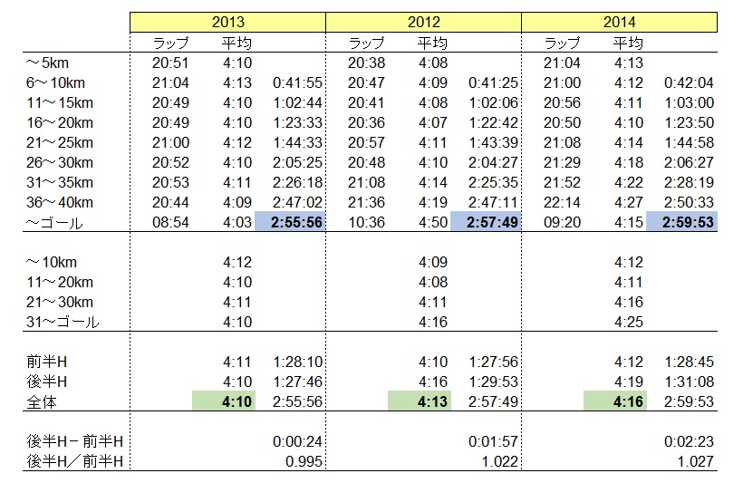過去3回、どれも湘南国際の3週間後だったつくば(正確には、2012が22日後、2013が21日後、2014が20日後)。初つくばとなる2012は、初サブスリー後だったので余裕を持って走れ、タイムを50秒ほど縮めることができた。2013は調整に失敗しサブスリーを逃した湘南の後、更にスランプかと思えるほど不調で、半ば開き直って臨んだら、意外や意外に一気に55分台を叩き出せた。そして昨年は、(1) 20度を超え風も強かった湘南でのダメージが残ったまま、(2) カーボローディング失敗(体重オーバー)、(3) 予想外の渋滞にはまり会場到着が遅れる、(4) しかも記録証提出を失念しBブロックからのスタート。どれもこれも自分のミス。4'09イーブンでおし通し、余力があるという前提でラスト2kmでペースアップし55分切り(ラストスパートしきれなくても55分56秒のPBを更新する)という目標。が、もうとにかく走りのリズムがつかめず、木っ端みじんに打ち砕かれ、辛うじてサブスリーという結果。