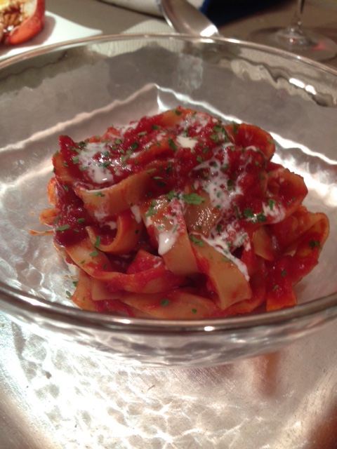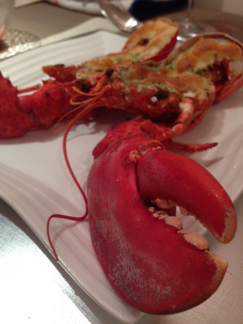 2品目:オマール海老のオーブン焼きと、トマトソースのタリアテッレ。ケーキに使った生クリームが残っていたので、パスタに添えてみたら、雰囲気出た(笑)。