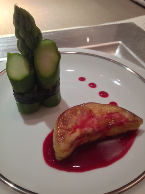 3品目:フォアグラのソテー、ブルーベリーソースと、門松風アスパラガス(笑)。ソースはもうちょっとどろっとさせたかった。まさかの、海苔が大活躍。