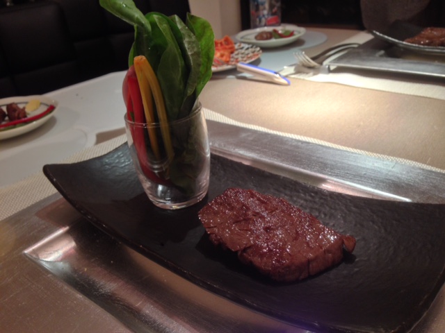 4品目:娘が選んだカイノミのステーキ、スイスチャードを添えて。シンプルに塩コショウのみの味付け。