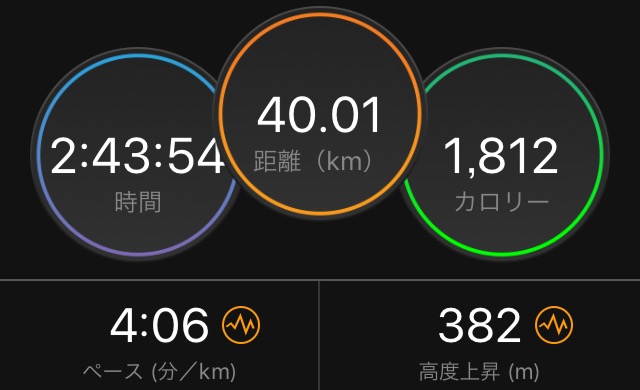 テーパリングをして臨んでいないし、3週間連続30km走と喜多ハーフに続いての、今回の40km走。疲労を踏まえれば、強度の高いポイント練習ができたような気がする(そう信じたい!)。
