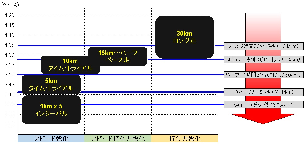 現時点のベストタイム(右側グレーのボックス)を基準に、コアとなる練習メニューが黒色のボックス。