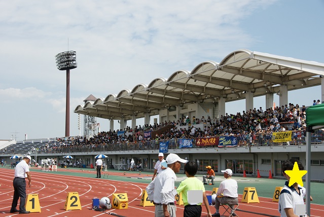 娘が見るスタンドは、各校の横断幕や家族でぎっしり。こんな状況で走れる娘が羨ましい(笑)。