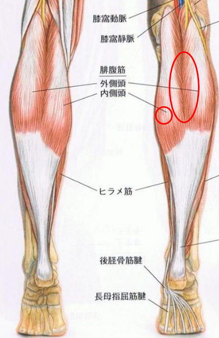 痛いのは赤丸で囲った部分。局所的に違和感あり。筋肉痛の痛みとは異なるのが、なんとなく厄介。
