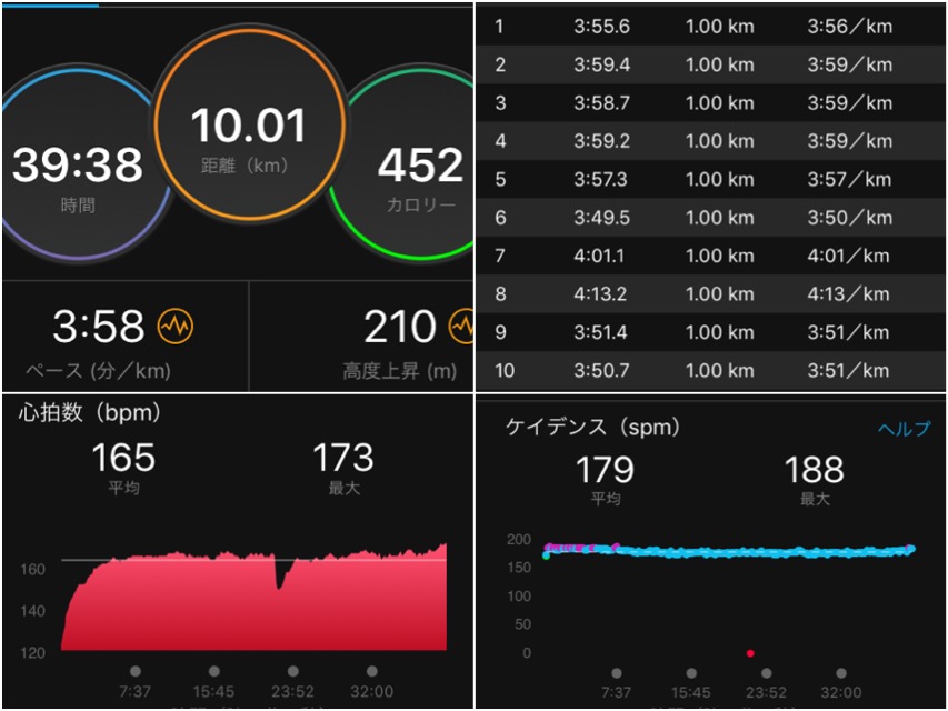 10km通過が39:36、平均ペース3'58。心拍はちょい高めだけど、それほどドリフト現象がなく安定しているし、ピッチも179と悪くはない。