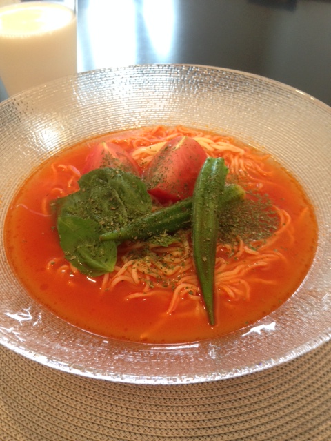 昨日のトマト事件(笑)。ランチはトマト麺だった。冷やし中華みたく、冷やしパスタみたいな感じだった。