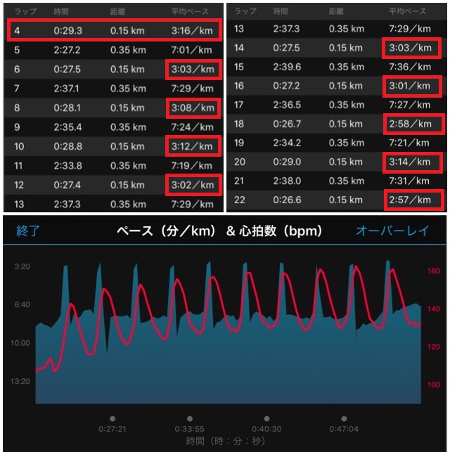 最初の2本は距離感をつかみ、慣れるために流す感じで。3本目からガチ。持久力を鍛えることが目的ではないと理解しているので、レストはゆっくり目で、呼吸をしっかり整えるようにした。