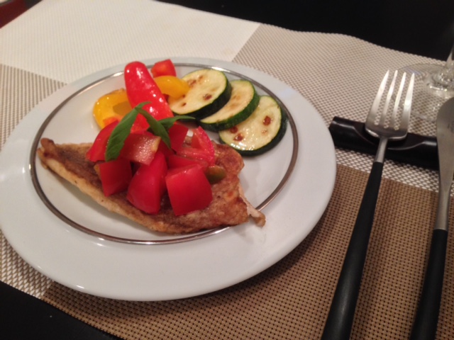真鯛のポワレ、ズッキーニとパプリカのグリル。トマトがあったので、ダイス状にしてバジルとともに添えてみる。うまい。