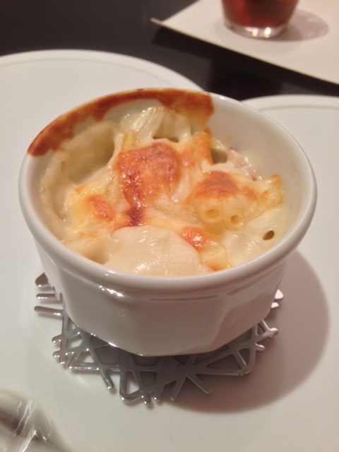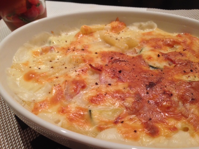 メインのグラタン。シンプルに、マカロニ、ベーコン、ズッキーニ。チーズの焦げ具合がヤバいemoji