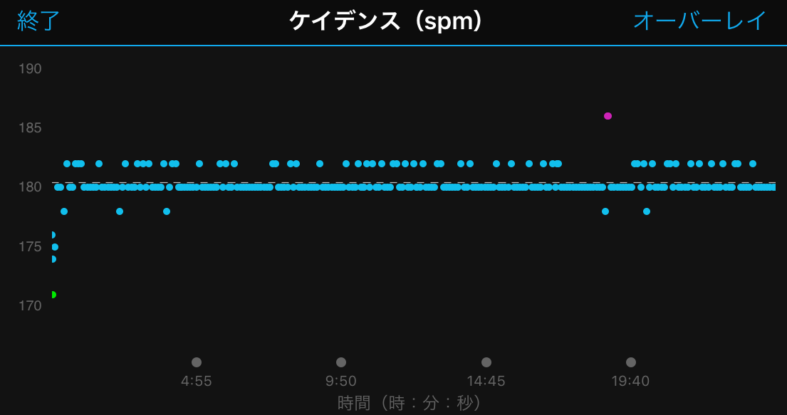 ピッチはガーミン上では平均174。メトロノームにほぼ完ぺきに合わせて走ったので、ガーミンにもその結果がきれいに出た。