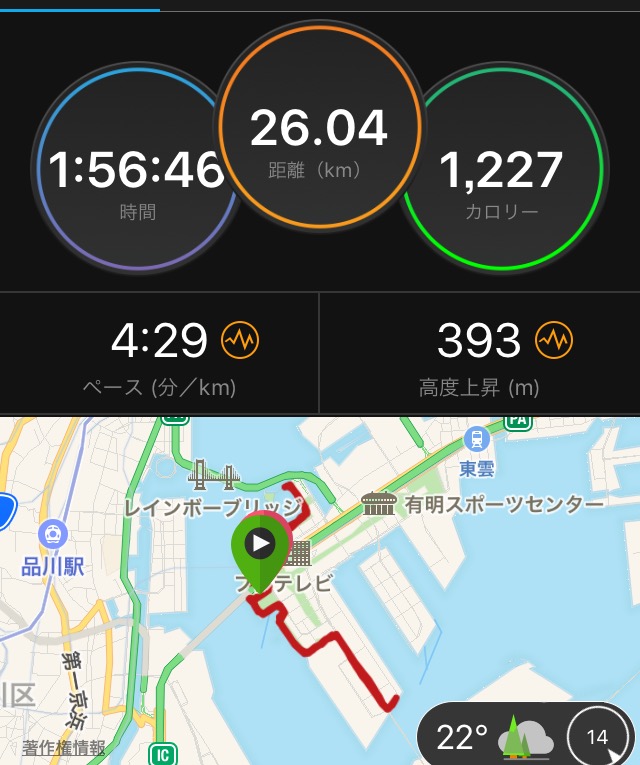 日曜朝は、ハーフ1週間前ということで、あまり無理せず4'30/kmペースで26km(お台場のマイコース2周)。