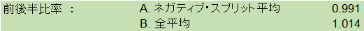 ② 次に、その前後半比率の、ネガティブ・スプリットのレースのみの平均値と、全体の平均値を計算。
