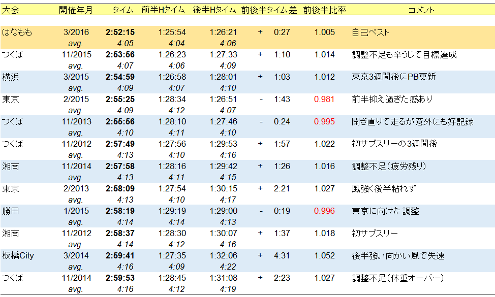 ① まず、サブスリーで走ったレース12本で、前半・後半ハーフのタイムを用いて、前後半比率を計算。