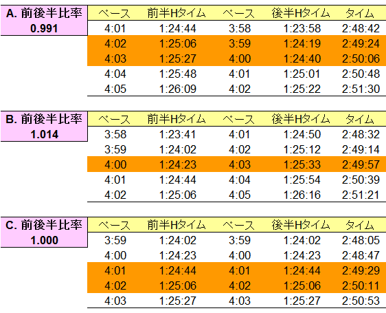 ③ 前半ハーフの設定ペースを変数とし、各平均値に基づく後半ハーフのペースを計算。AとBの平均がちょうど1.0となるので(その値には意味はないけど)、3つ目のケースとして採用。